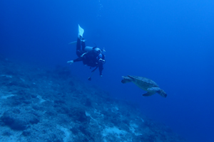 一緒に泳いでくれました!カメにガイドされるIさん♬