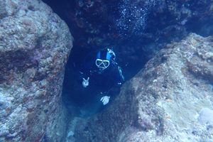 岩の隙間に隠れてはダイバーに回り込まれ、挙句の果てに挟み撃ち・・・